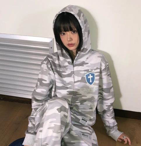 High-neck white camo hooded sweatshirt (semi-over)